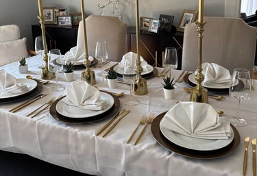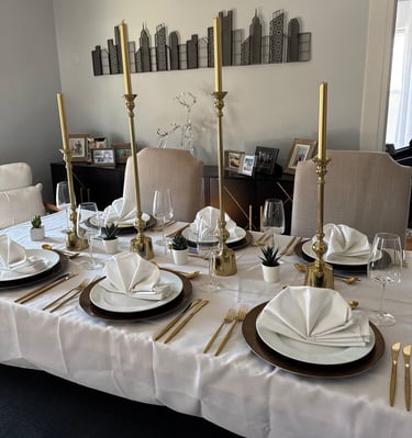 experience. Based in Chicago and inspired by global aesthetics with a uniquely South African flavor, we design tablescapes that transform gatherings of every size into unforgettable moments. From intimate Thanksgiving dinners in your home to large-scale celebrations at venues and weddings, our team handles everything from design to delivery and full setup. Each tablescape is curated with intention, blending texture, color, and storytelling to create an atmosphere that evokes emotion, sparks joy, and becomes part of your most cherished memories.